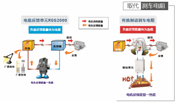 取代傳統(tǒng)動態(tài)煞車電阻裝置。一般傳統(tǒng)交流變頻器驅(qū)動馬達(dá)在運動瞬間或頻繁煞車時,利用安裝高瓦數(shù)的煞車電阻來吸收過多的反饋能量,并轉(zhuǎn)成熱能散發(fā)。解決負(fù)載能量反饋但效率不佳,且增加硬件額外費用與空間。使用AFE2000系列之后,負(fù)載反饋的能量不需要再轉(zhuǎn)換成熱能散發(fā)掉,相對的可以將反饋能量回饋到電網(wǎng),省電省錢而且環(huán)保,如下圖所示。