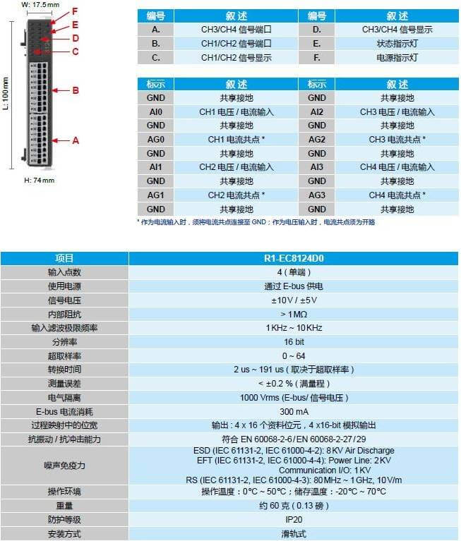 EtherCAT 4 通道模擬輸入擴展模塊 - R1-EC8124D0 4 通道模擬輸入擴展模塊,搭配 E-BUS 電源模塊可提供 EtherCAT 主站遠程模擬信號的控制