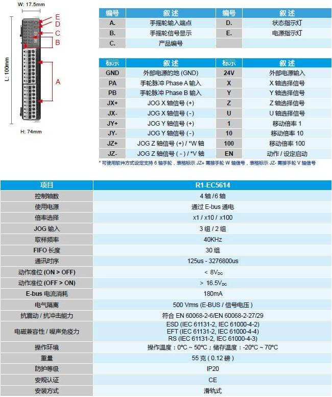 EtherCAT 手輪擴展模塊 – R1-EC5614D0 手輪擴展模塊,需搭配 E-BUS 電源模塊使用,可提供 EtherCAT 系統接收手輪信號輸入。