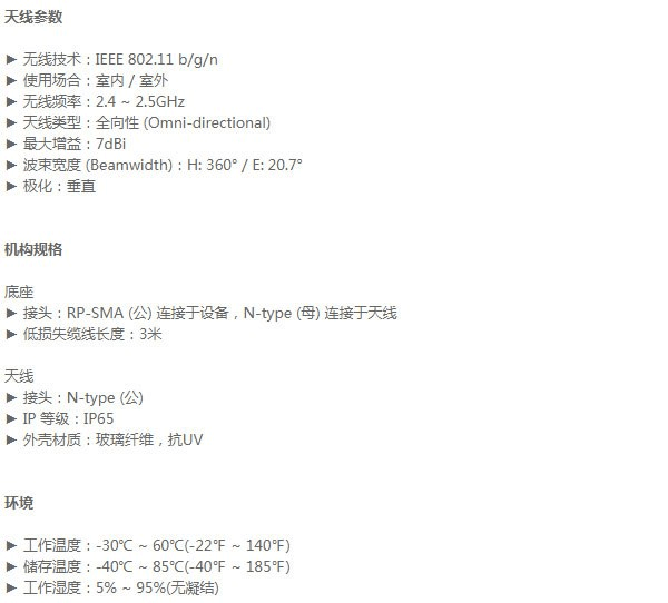 產品特色 8dBi 高增益天線加強無線傳輸效能 超強磁力3米延長線底座,RP-SMA(male)接頭 IP65高防水、抗UV設計,適用于各種氣候條件 安裝容易,無論使用于室內與戶外環境 技術規格